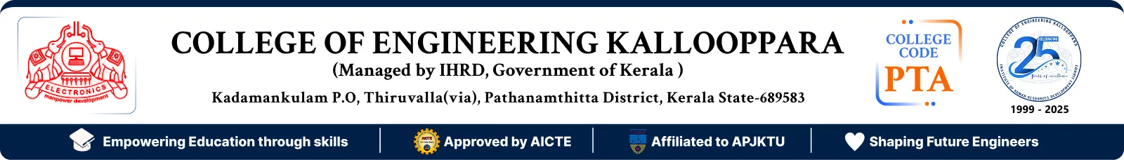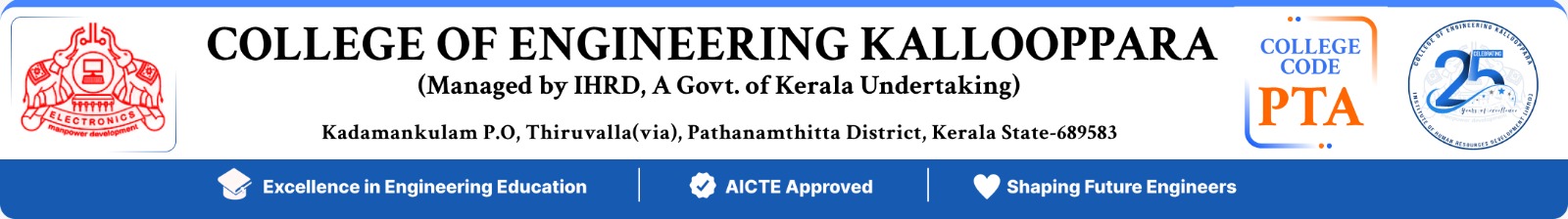 College of Engineering Kallooppara (CEK), located in the Sylvan hills of Pathanamthitta district in the state of Kerala is one of the premier institutions among the new generation Engineering colleges of South India. Ever since its inception under the aegis of the Institute of Human Resources Development (IHRD-Established by the Govt. of Kerala), the college has already made its presence felt in the technical horizon of the State. The College is affiliated to the APJ Abdul Kalam Technological University (APJAKTU) and is approved by the All India Council for Technical Education (AICTE), Government of India.